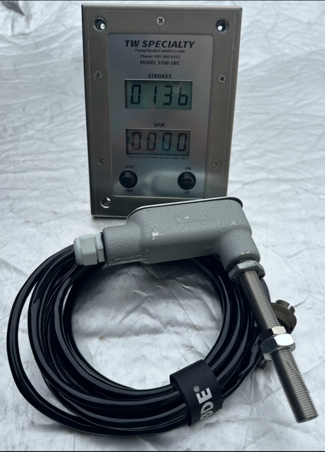 After 5 minutes of inactivity the pump section will go to standby. The count is held in memory, even during standby. As soon as the counter detects a stroke the LCD’s will power up and the count and strokes per minute will resume. The rate display is updated with every stroke. This saves battery life. Our rate meter uses 4 AA lithium/Duracell batteries and allows you to replace them in the field saving you expensive replacement battery pack cost and down time.